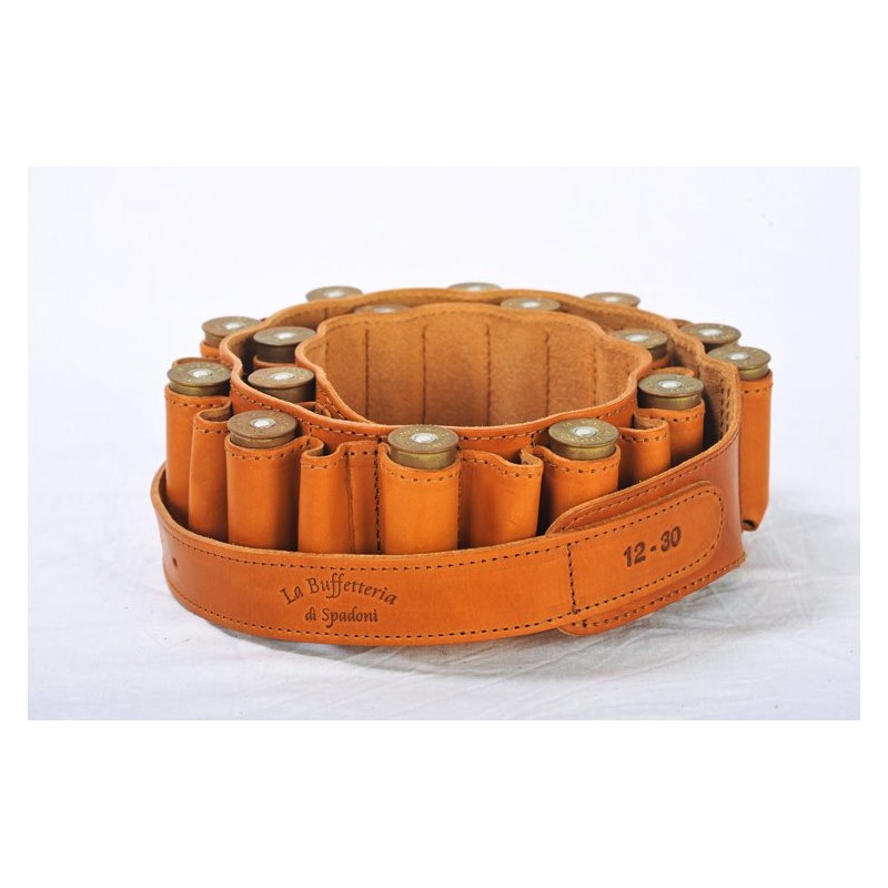 Cartouchière en cuir marron graissé, non doublée, fermeture à 20 alvéoles avec boucle métallique de 30 mm.