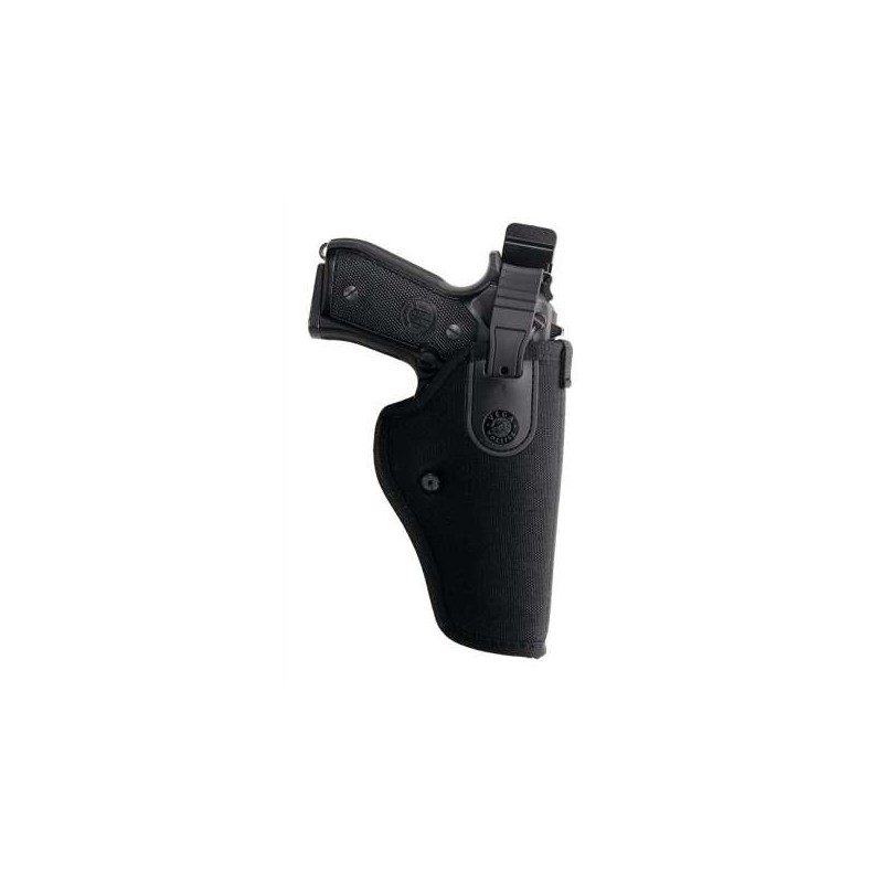 Holster en cordura avec une face arrière de fixation en polymère pour ceinture et ceinturons. Pattes de sécurité réglable et amovible.