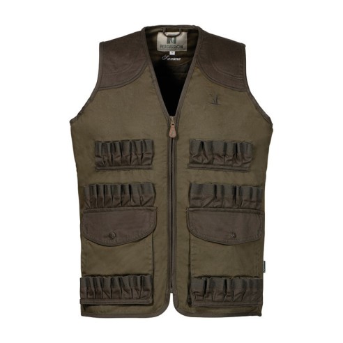 65% polyester, 35% coton. Traité déperlant. Renforts aux épaules, 2 poches repose-mains, pattes de maintien douverture, 2 grandes poches basses avec cartouchières intégrées (balles et plombs), cartouchières extérieures 16 tubes, 2 poches intérieures dont une poche pour téléphone portable, anneau porte-gibier, carnier avec doublure étanche, lavable et...