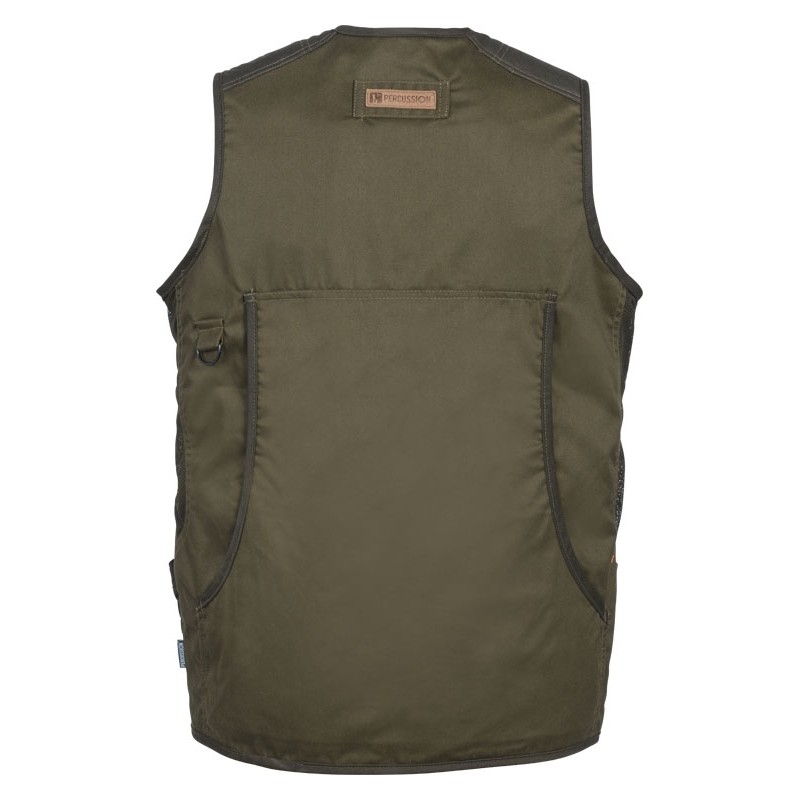 Gilet réversible, côté kaki: 80% polyester, 20% coton, filet d'aération sur les côtés 100% polyester. Renforts aux épaules, 2 grandes poches basses, cartouchières extérieures 18 tubes, anneau porte-gibier et grand carnier dans le dos. Côté camo: 100% polyester, filet d'aération sur les côtés 100% polyester. 2 grandes poches basses, cartouchières extérieures 18 tubes, 3 tubes pour balles à la poitrine, anneau porte-gibier et carnier avec doublure étanche et lavable. Normé CE